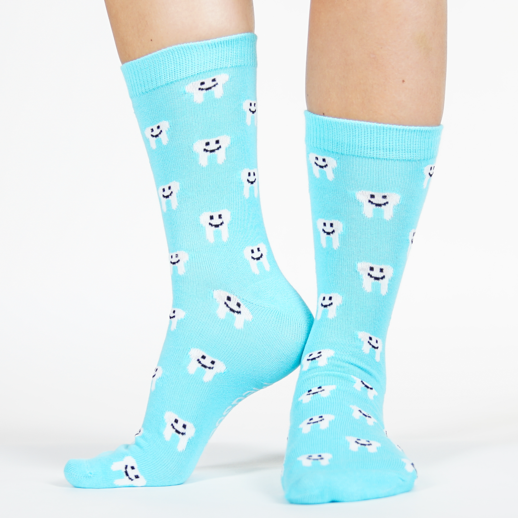 Dit zijn de leukste vrolijke tandensokken die er zijn. Het mooie clinische lichtblauw past goed bij de stralende witte tandjes die naar je lachen.