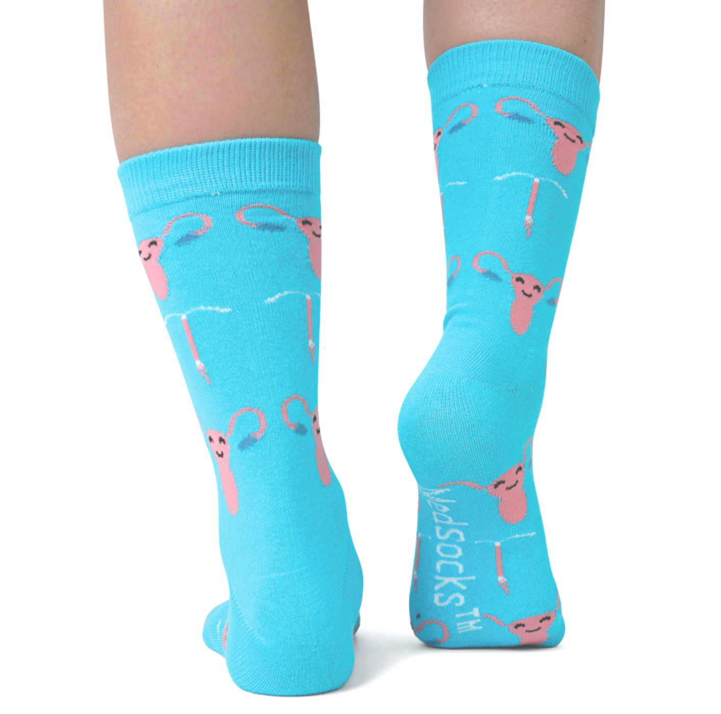 Don’t ovary-act, maar deze zijn wel heel leuk! Prachtige blauwe sokken met baarmoeders en spiraaltjes! Wat een vrolijke (c)uterus sokken 😍